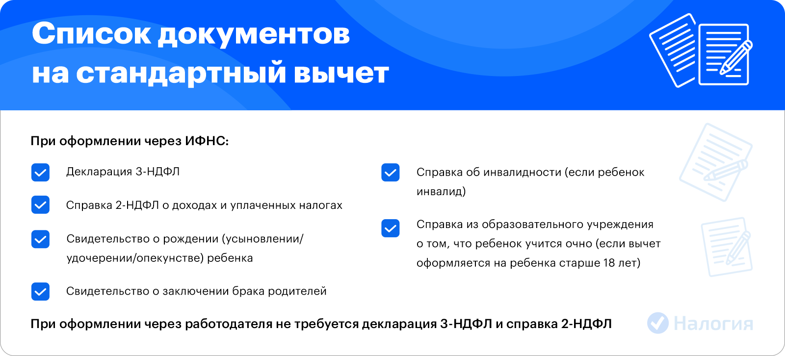 Чтобы оформить налоговый вычет на ребенка-инвалида через инспекцию, подготовьте:
