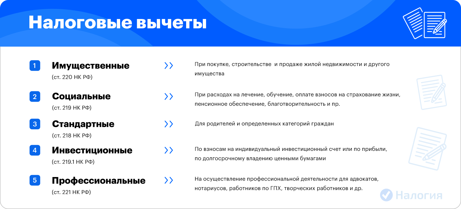 С помощью имущественных, стандартных, социальных и других налоговых вычетов вы можете законно вернуть деньги в семейный бюджет. Помните, что часто вернуть средства можно не только за себя, но и за своих близких — какие налоговые вычеты за членов семьи можно получить от государства, читайте в нашей статье.