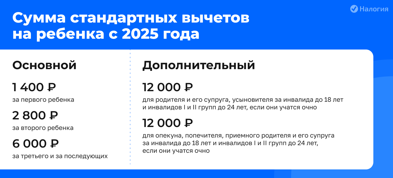 12 000 руб. — для родителя, его супруга, усыновителя за инвалида до 18 лет и инвалидов I и II групп до 24 лет, если они учатся очно. 12 000 руб. — для опекуна, попечителя, приемного родителя, его супруга (супругу), на обеспечении которых находится инвалид до 18 лет и инвалидов I и II групп до 24 лет, если они учатся очно. |