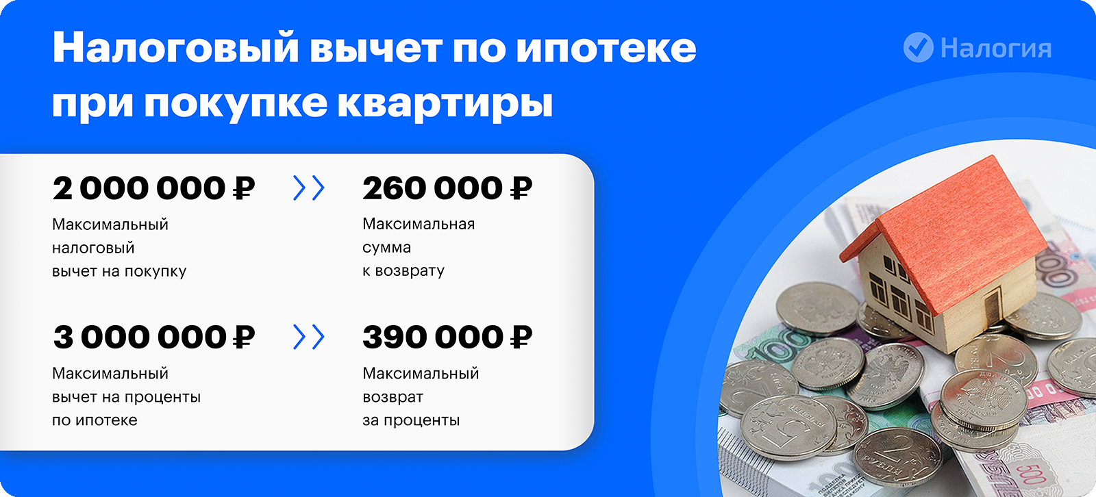 Основной и ипотечный вычеты суммируются, и в итоге максимальная сумма возврата по ипотеке составляет 650 тыс. рублей на каждого собственника. Из них 260 тыс. рублей — на стоимость покупки и 390 тыс. рублей — возмещение НДФЛ за уплаченные проценты по ипотеке.