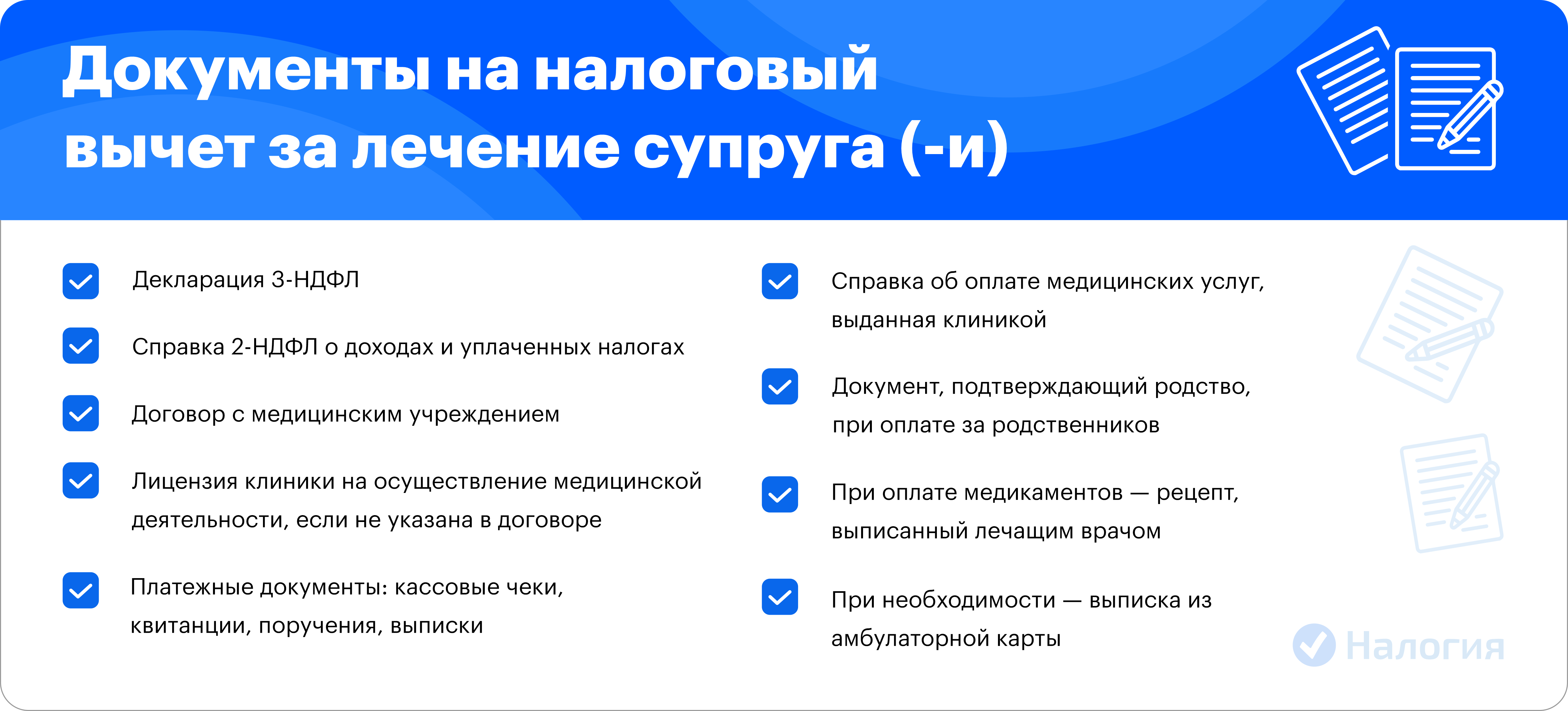 - Платежные документы, подтверждающие расходы на лечение супруга.