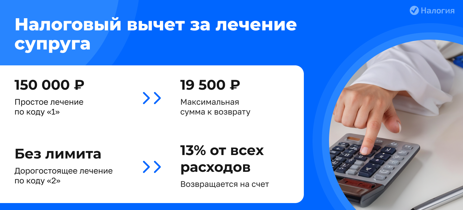 В 2025 г. Ольга заплатила 30 тыс. рублей за стоматологию супруга и 70 тыс. рублей — за свое лечение. Ольга вернет 13% от всех затрат — 13 тыс. рублей (100 000 * 13%), оформив налоговый вычет и за лечение мужа, и за свое собственное.