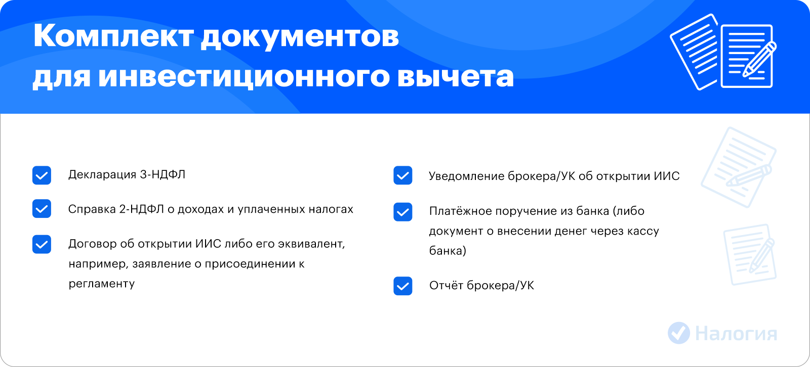 В пакет документов на инвестиционный вычет по НДФЛ входит: